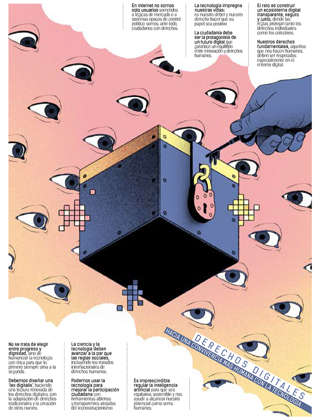 No todo está escrito ni cerrado. El entorno digital evoluciona tan rápido que necesita un proceso de reflexión constante. Por eso, no necesitamos un conjunto de normas rígidas, sino una brújula para los poderes públicos, un recordatorio de que cada avance debe ser acompañado por una defensa firme de nuestros derechos. También es un llamamiento a la ciudadanía para no ser meros espectadores, sino protagonistas de un futuro digital que garantice un equilibrio entre innovación y derechos humanos.